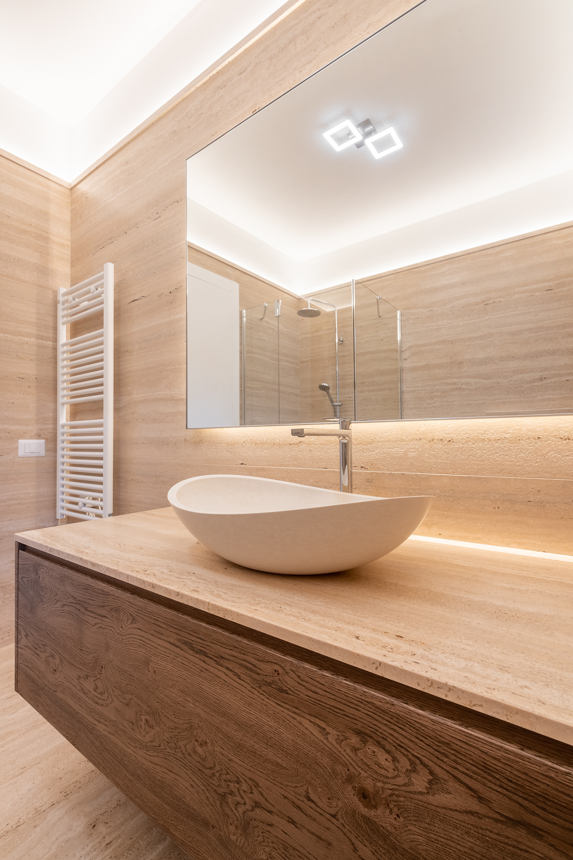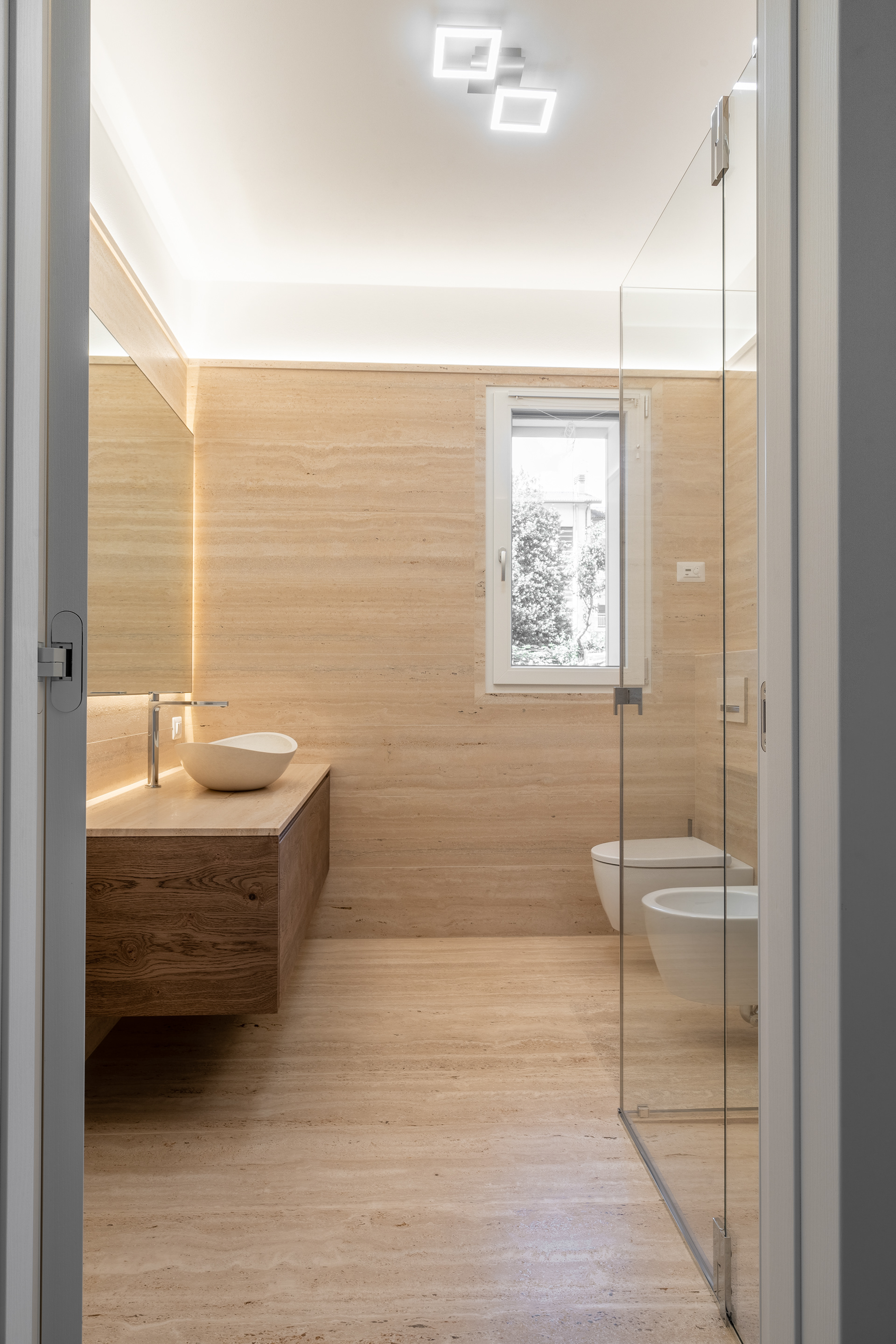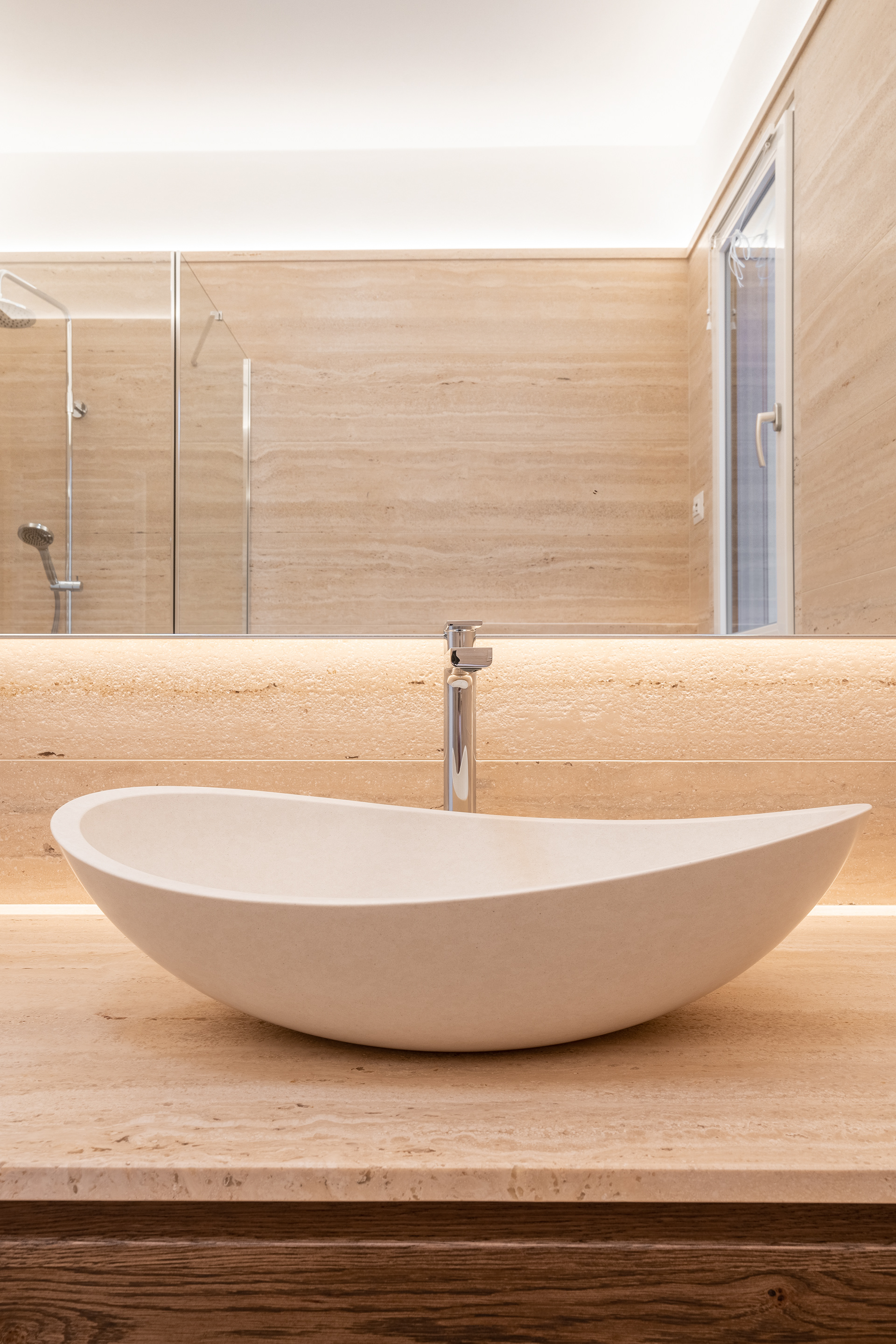 Modern bathrooms adorned with natural stone feature a minimalist style that creates an elegant, refined, and timeless atmosphere.