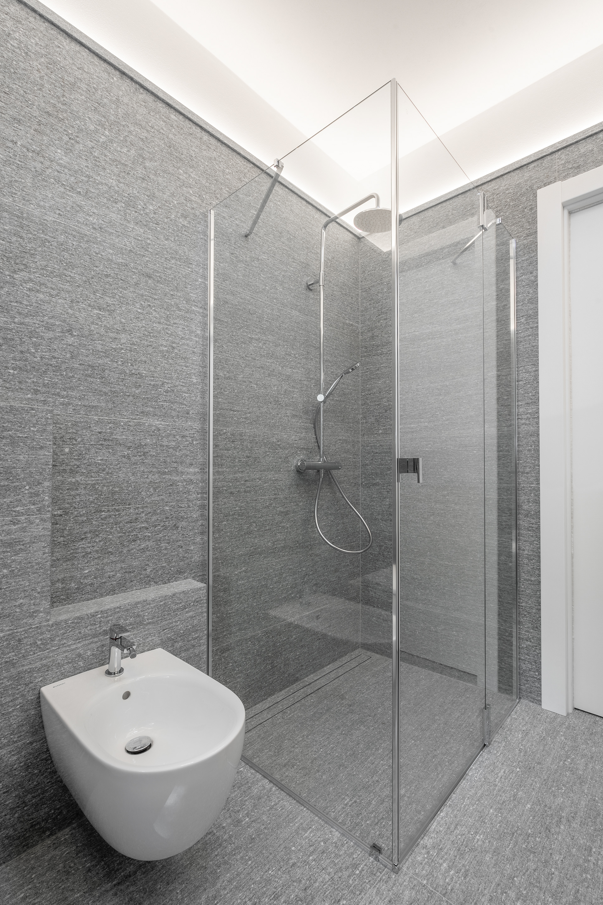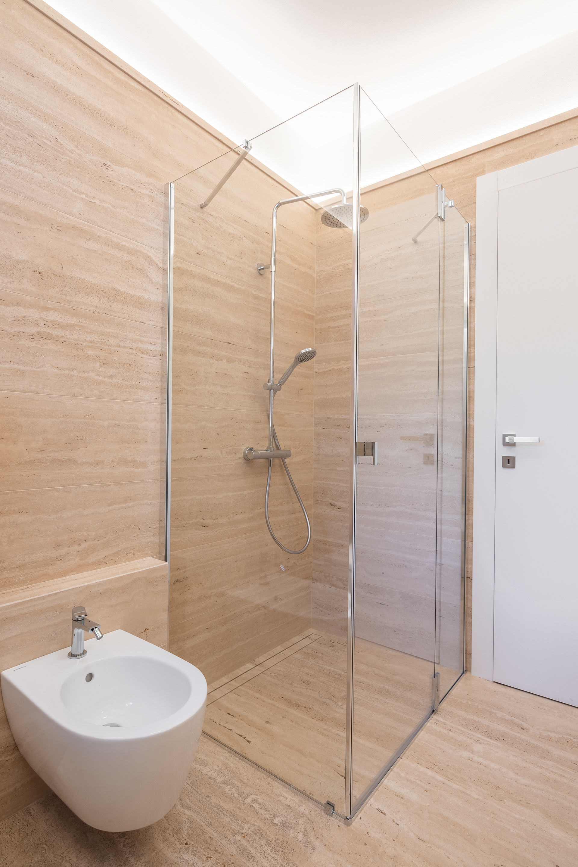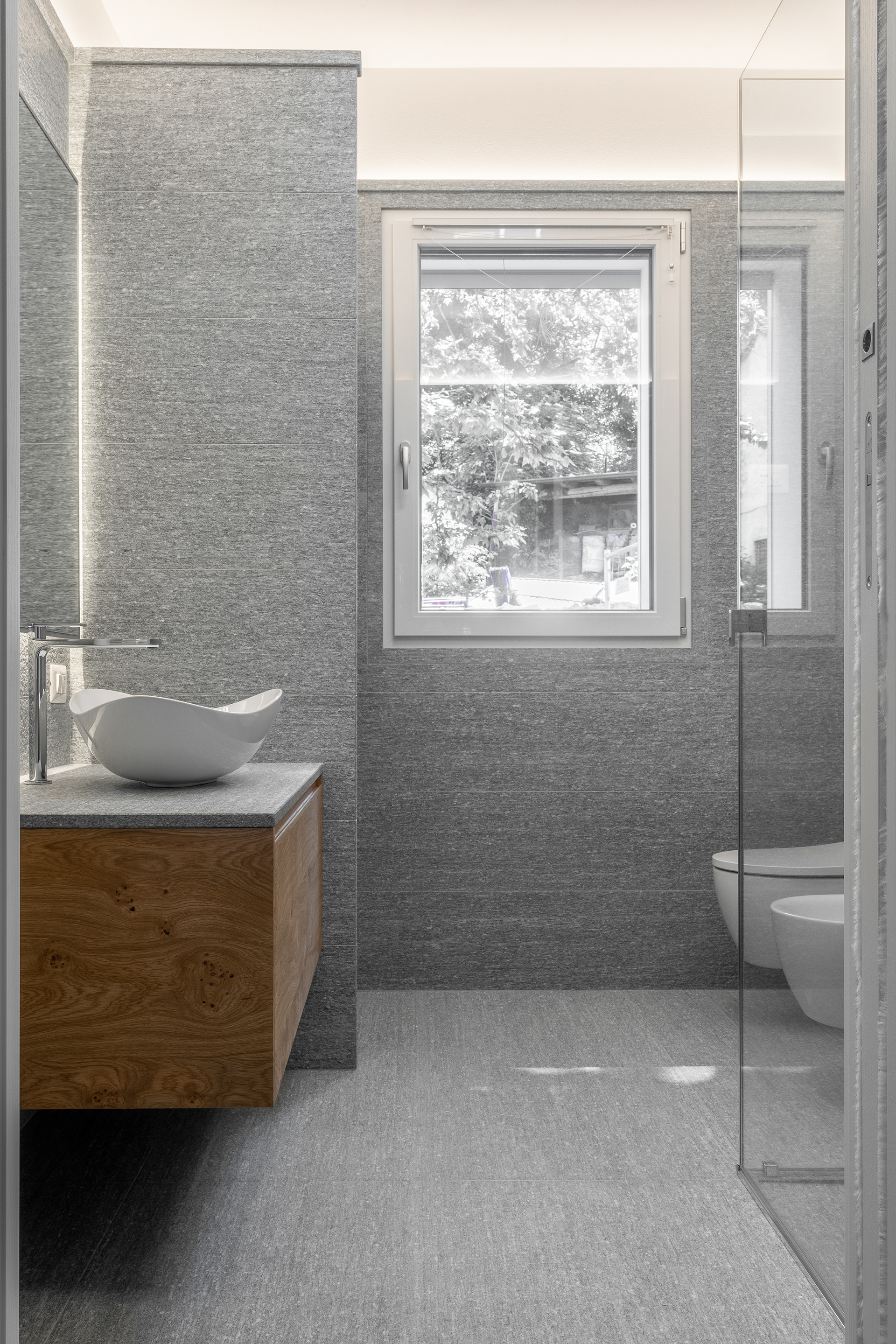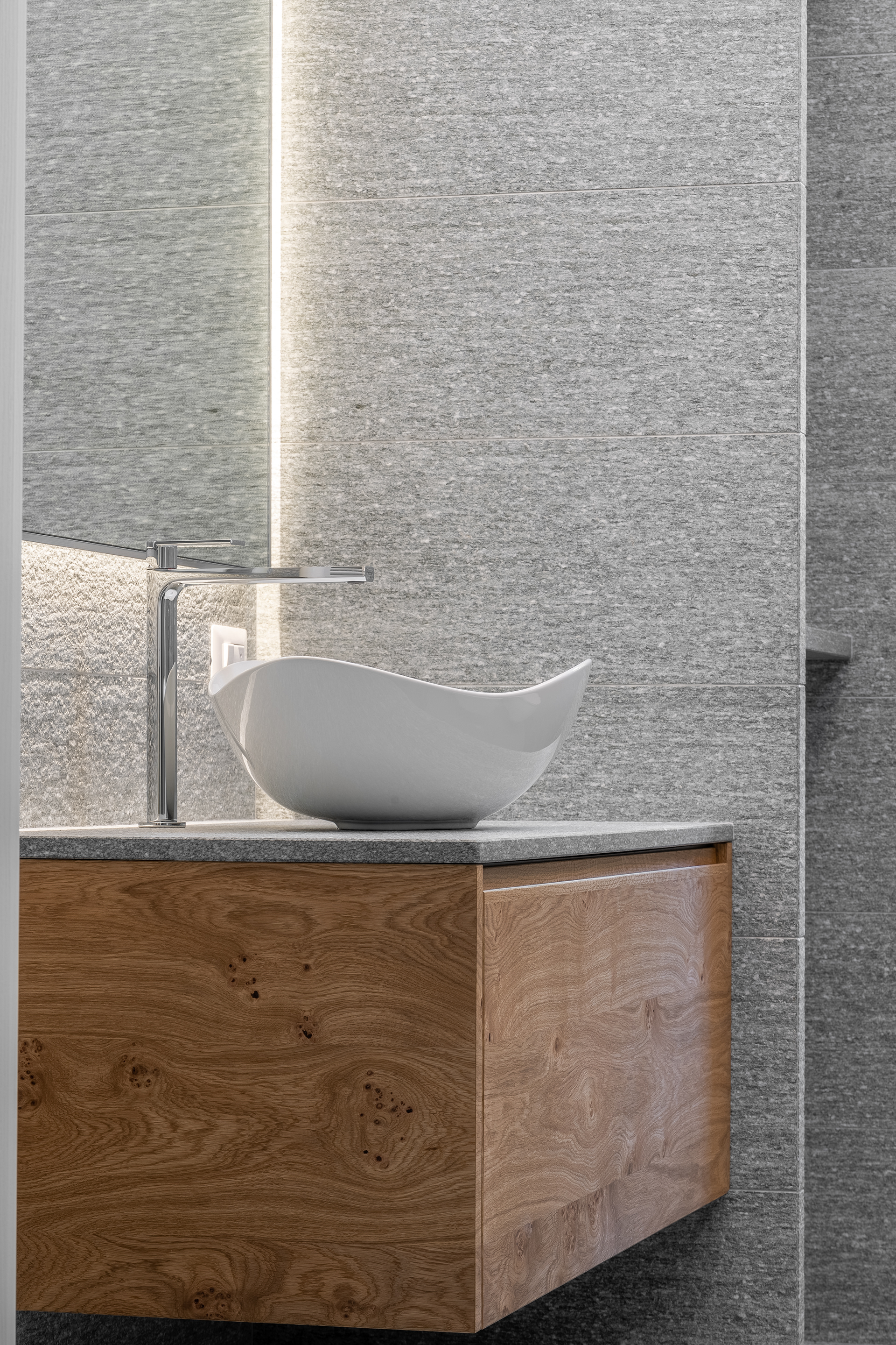 Modern bathrooms adorned with natural stone feature a minimalist style that creates an elegant, refined, and timeless atmosphere.